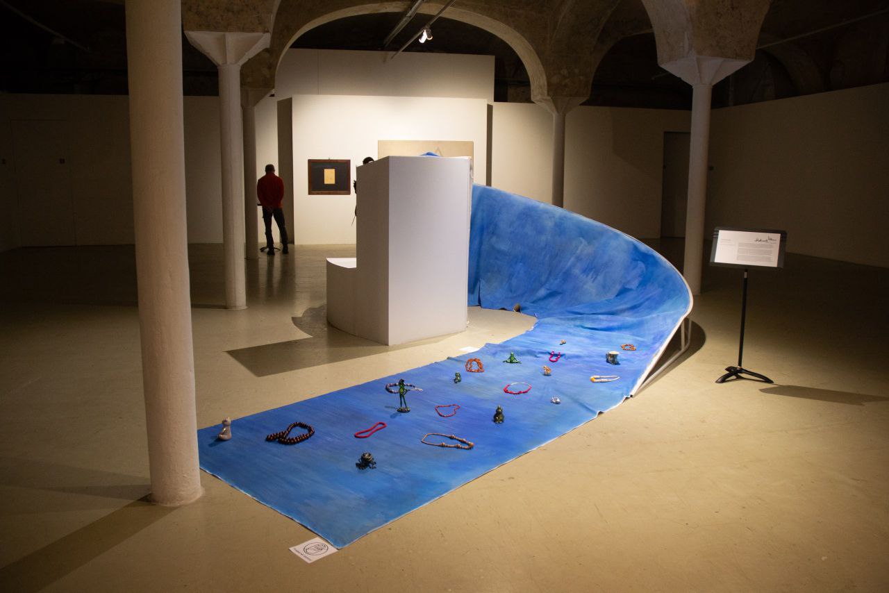 Glass, metal, silk threads, candys, baby rug. 2021.